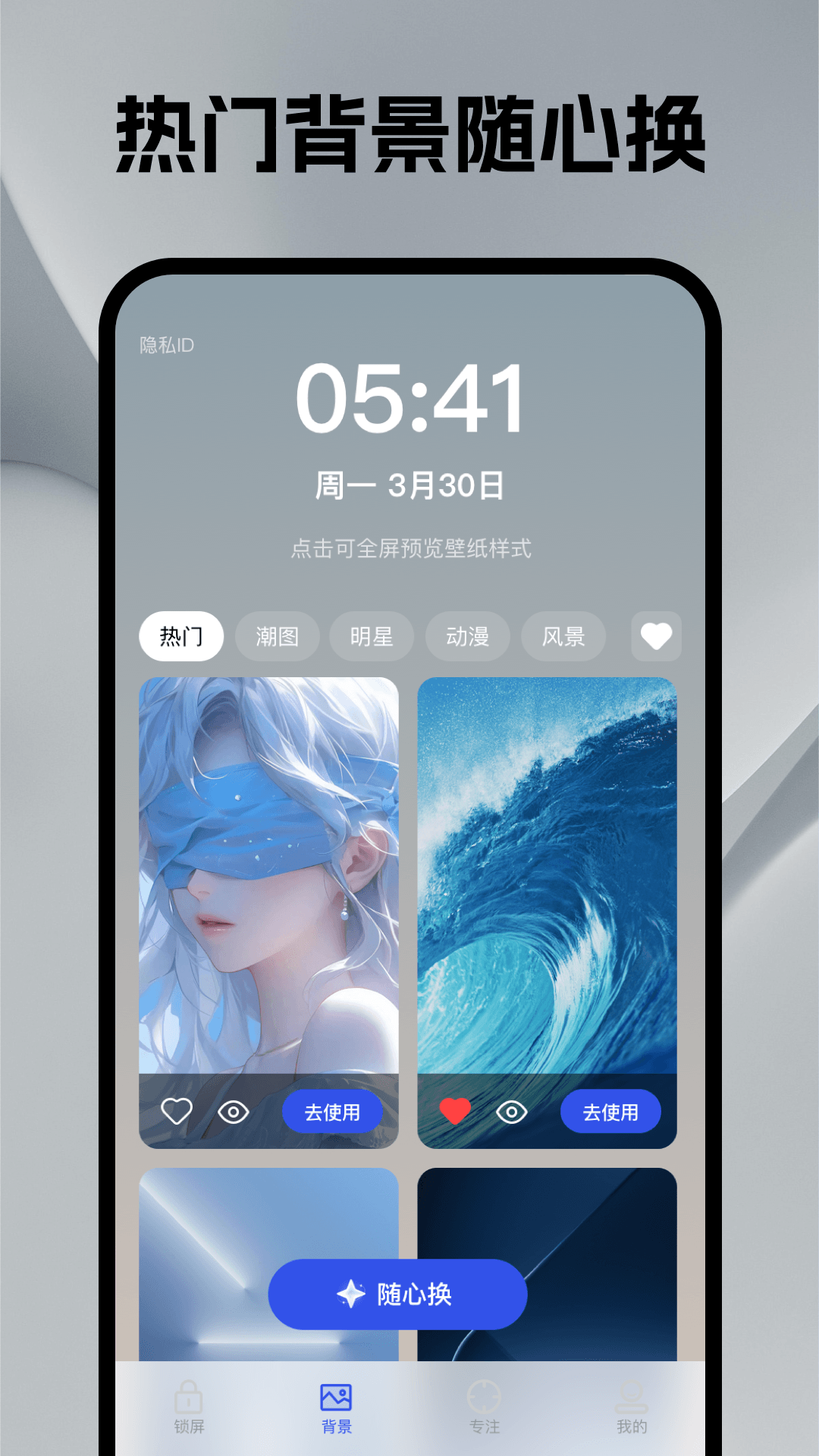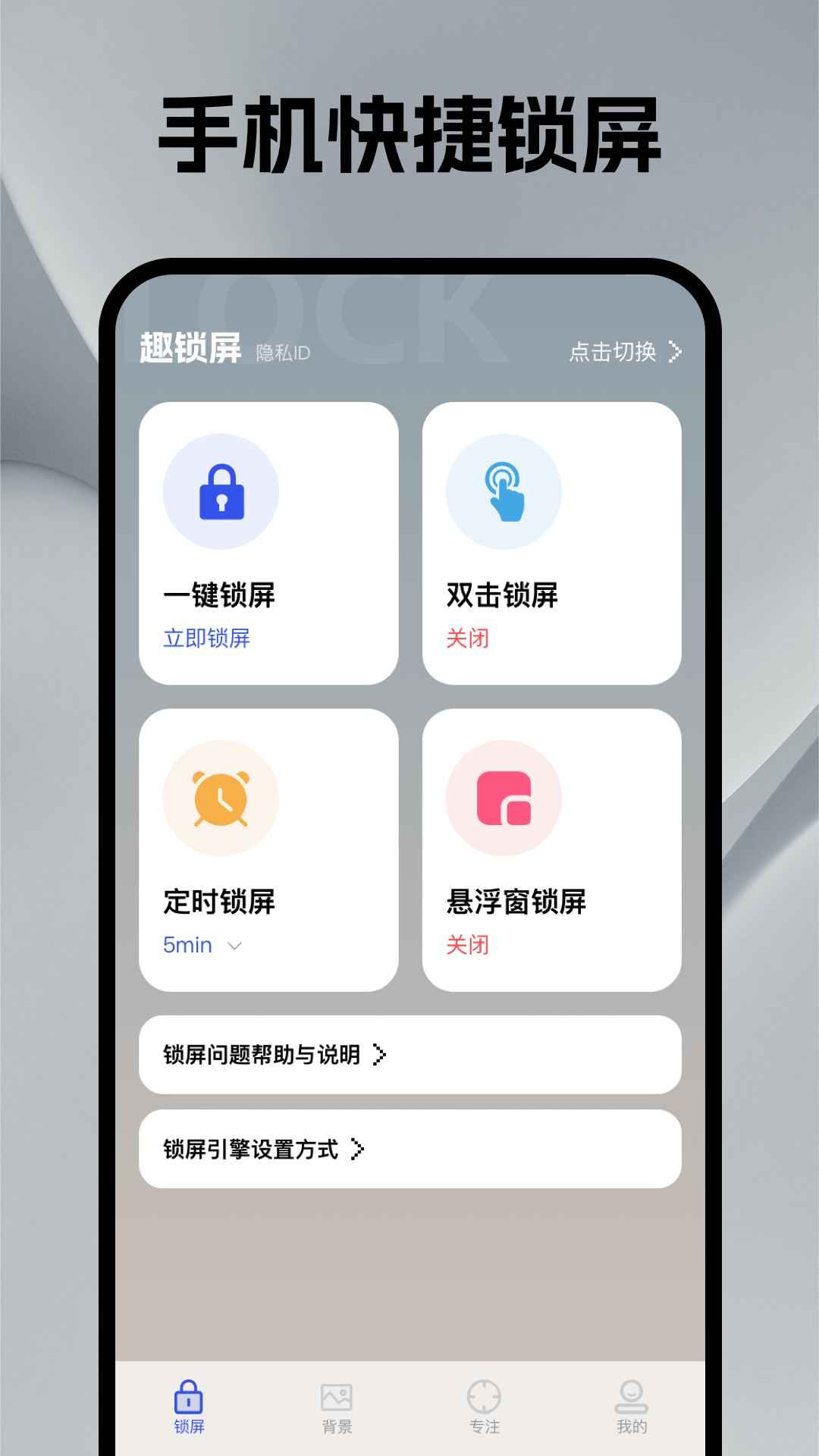 是一款集便捷工具、个性美化与高效专注于一体的锁屏应用。 核心锁屏:提供一键锁屏、双击锁屏、定时锁屏及悬浮窗锁屏,操作高效。支持自定义锁屏音效与全屏滚动字幕,增添趣味。 壁纸库:内置热门、动漫、风景等分类高清壁纸,配有锁屏时间大屏预览,点按即可快速应用。 专注模式:可设置自习室等场景与专注时长,开启后进入全屏倒计时,助力沉浸学习工作。 设置完备:包含反馈、协议及清单等完整设置选项,简洁纯粹,无广告打扰。