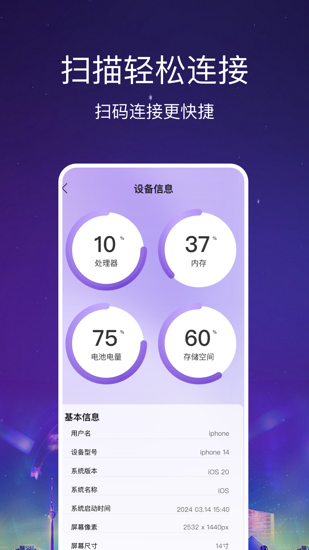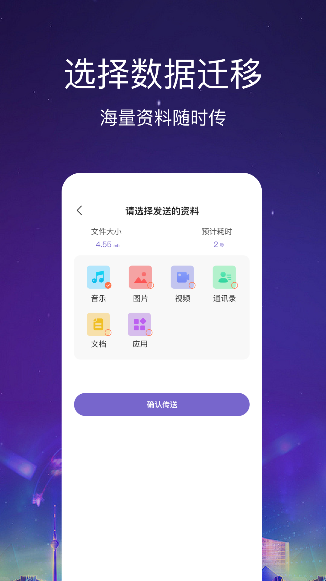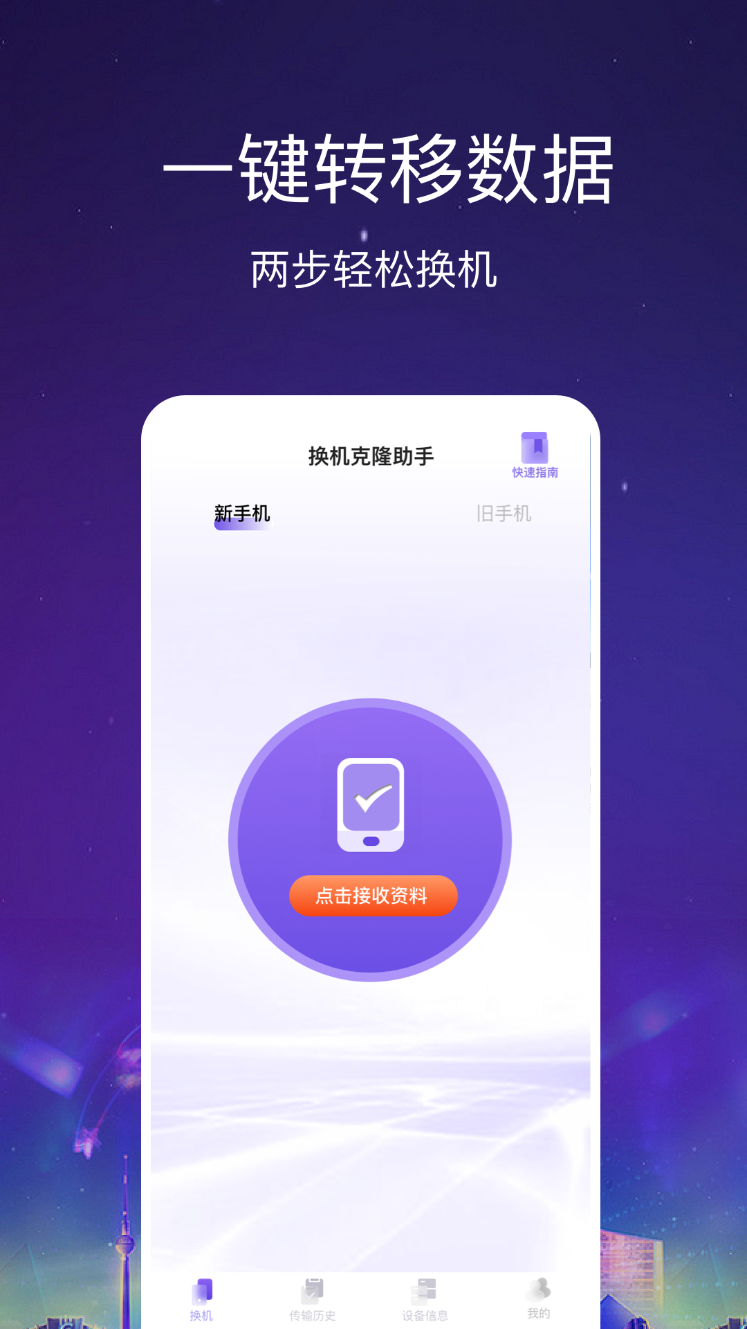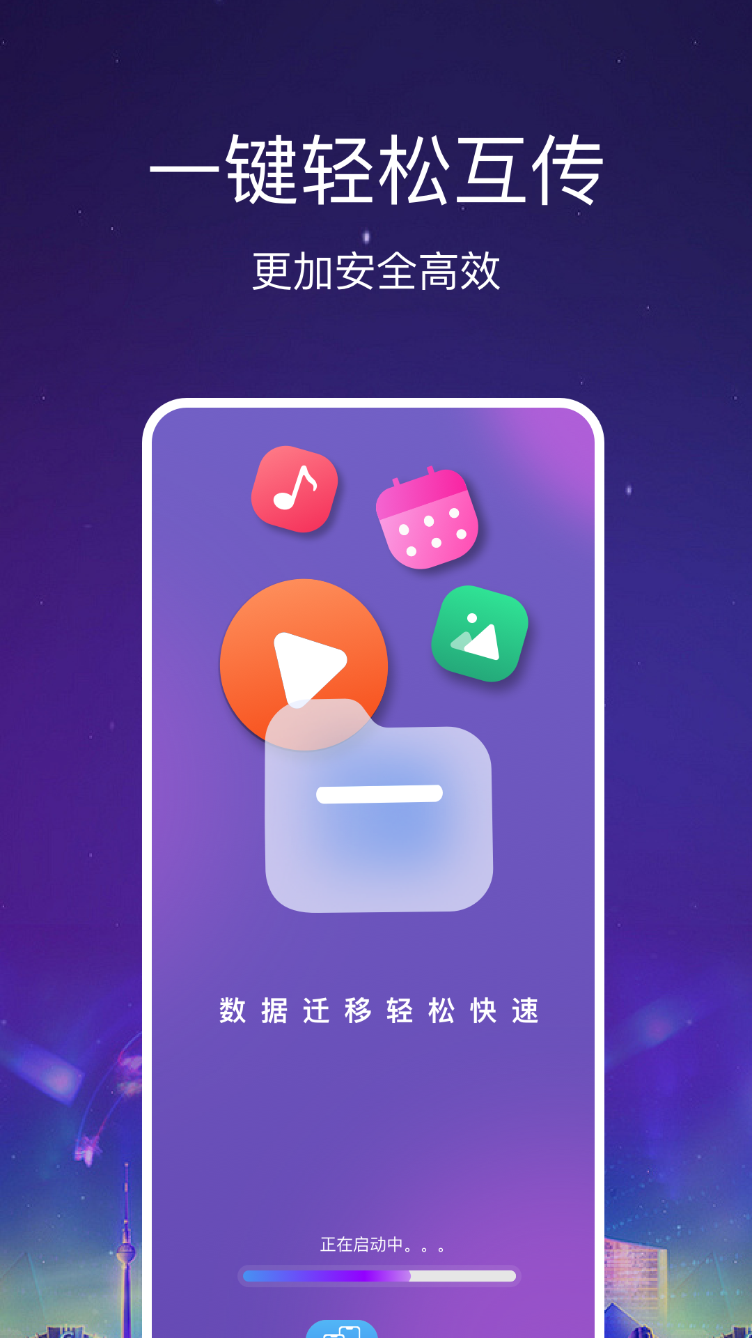 一款不用流量迁移数据轻松换机应用。支持不同安卓手机之间相互传输换机,可以一键传输视频,图片,通讯录,备忘录,提醒事项等;轻松传输海量数据,不消耗手机流量,节约时间不等待,无需数据线连接,面对面扫码即传,稳定不掉线,助您在更换手机时,备份数据